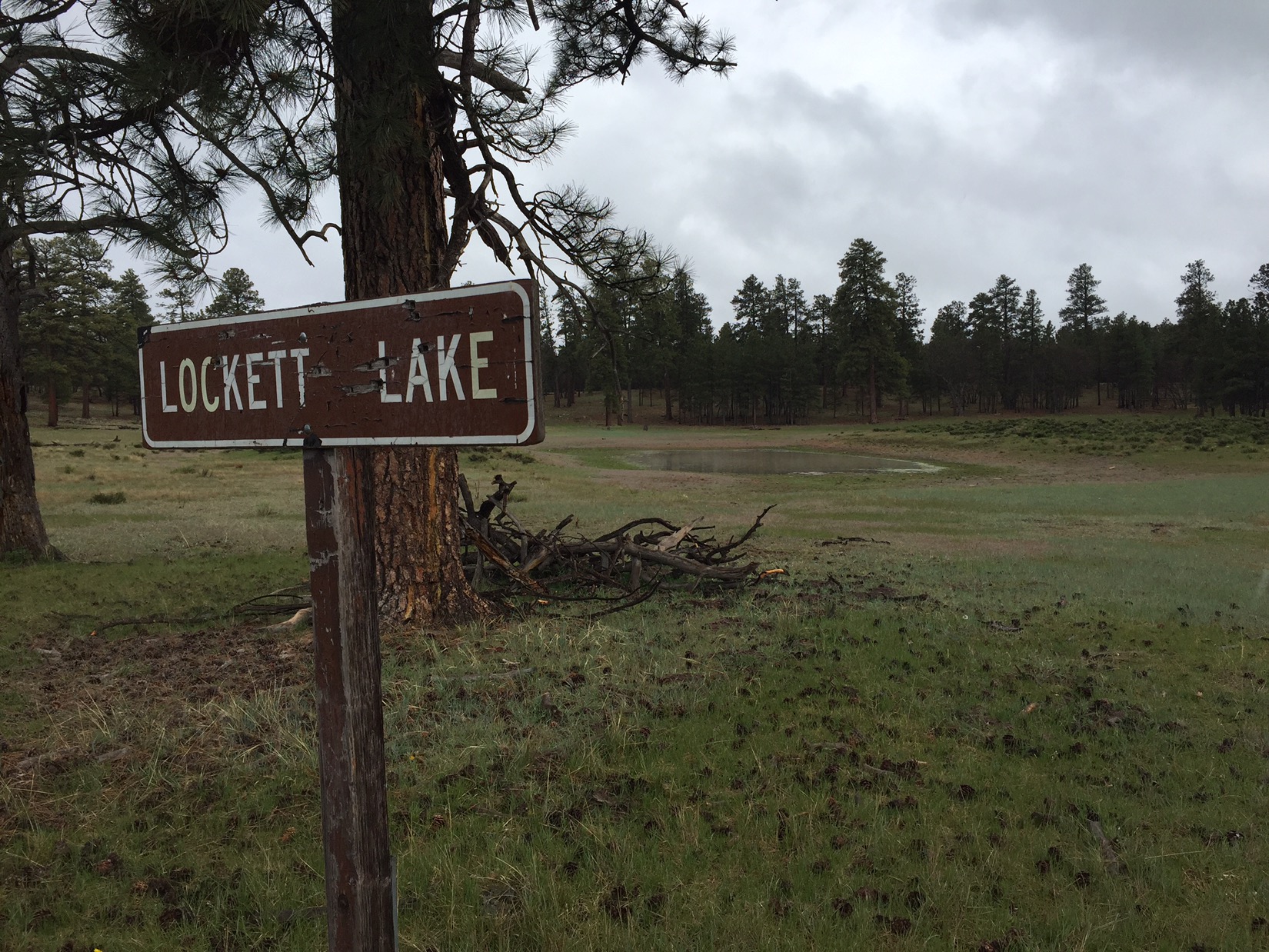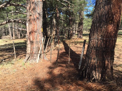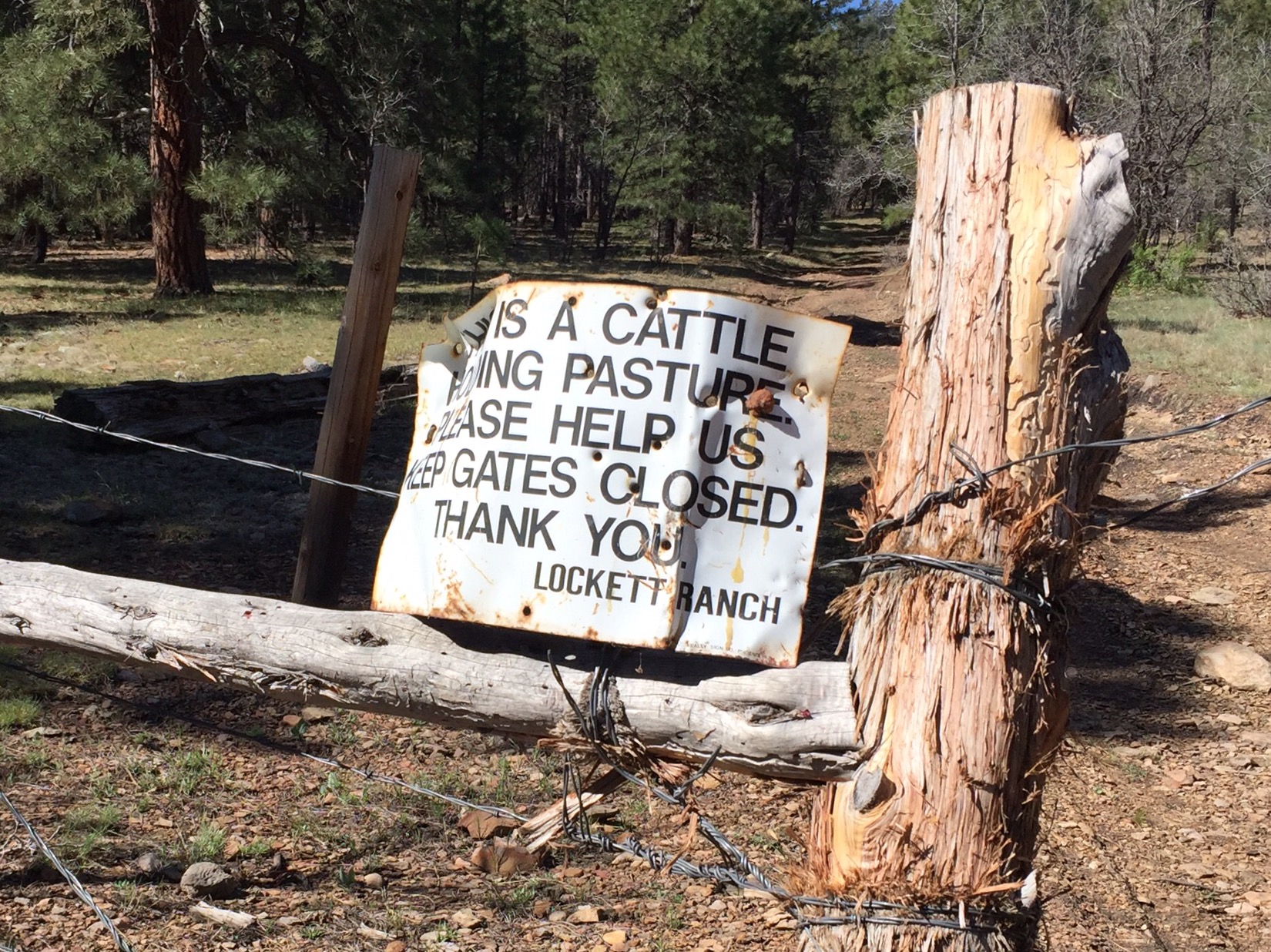 I set camp on a hill just above Mormon Lake and, with no threat of rain, sleep under the net and a dome of stars. When I wake, I feel completely present: no anxiety about timeframes or goals. I’m not sure whether it’s the book, the ease of terrain, or the rhythm of solitude. I walk easily on pine needles and think only of what’s around me. Not surprisingly, I miss a trail sign and soon I’m on the wrong forest service road. I walk ahead anyway and, as I cross a fence gate just below Mayflower Spring, a sign identifies the land as Lockett Ranch.