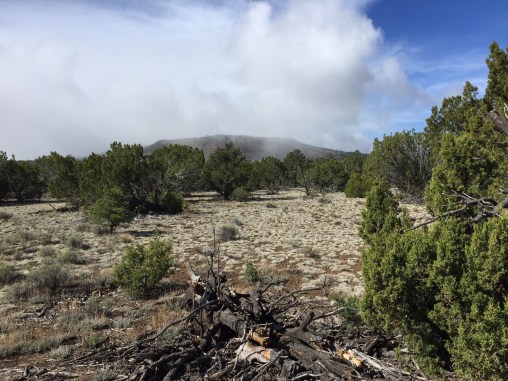 The day is nice. I walk mostly in dry weather with only the occasional rain but I’m surrounded by swirling boiling clouds of black, white and gray. The trail follows forest roads without snow but they are muddy. I see another thru hiker I first saw weeks ago outside of Oracle. For 3 hours David and I walk together. He was a Navy corpsman in the Gulf War and now walks as part of a veterans project. He saw good times and bad times he says. He is a good companion and the time flies.