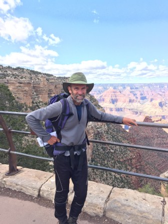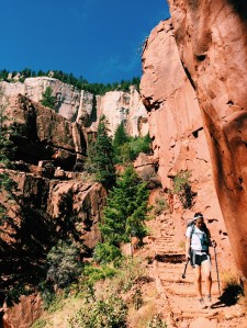 Emma and I break camp and do the easy walk to the North Kaibab Trailhead by 8:30. Then we’re over the rim and into the canyon. Every half hour we pass down through another vegetation zone (aspens, pines, pinyon) and another cliff layer (white, grey, red). We walk quickly and easily, getting into the rhythm of walking with 30 pound packs. Because it’s so remote, there are almost no day hikers on this side of the canyon, and the few people we see mean business: rim to rim hikers, an ultra marathoner going rim to rim to rim (about 50 miles round trip) and a work crew laying stone underneath the trail near Supai Tunnel.