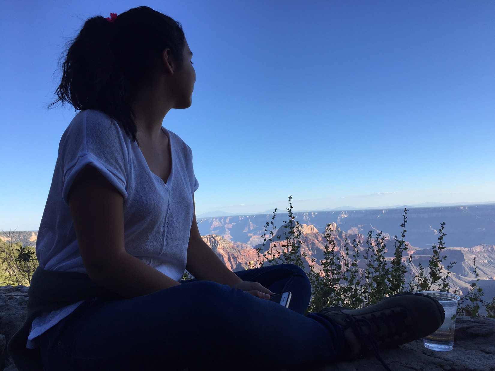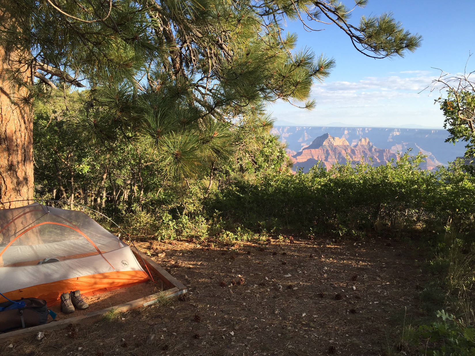 We’re camping 30 yards from the North Rim – not a soul or structure between us and the Grand Canyon. We’re preparing dinner while the last of the sun lights up the red cliffs below us. If all goes according to plan, tomorrow morning we’ll wake up around sunrise and start our Rim to Rim hike. Emma’s hotel room