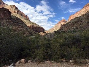 Below Supai TunnelLast summer, we had hiked to just below Supai Tunnel as a family, so from here on its all new territory. After 4 miles we pass Roaring Springs, which supplies drinking water to the North Rim above us. The water gushes from the bottom of the cliff to the east, then settles into a cold creek that parallels our trail for the rest of the day. Just after noon we’ve hiked 7 miles and reached Cottonwood Campground. The canyon opens up and the desert views are amazing.