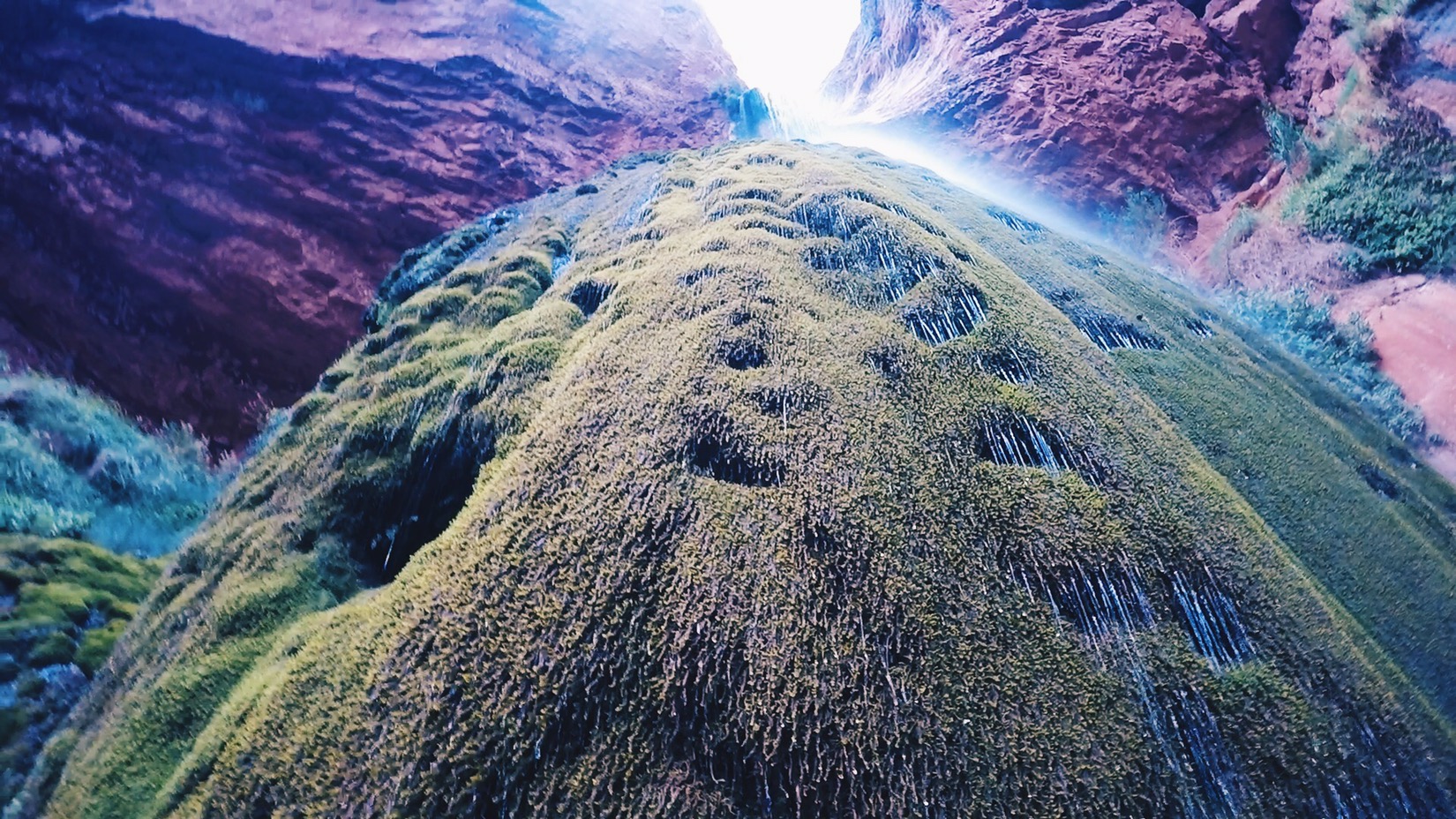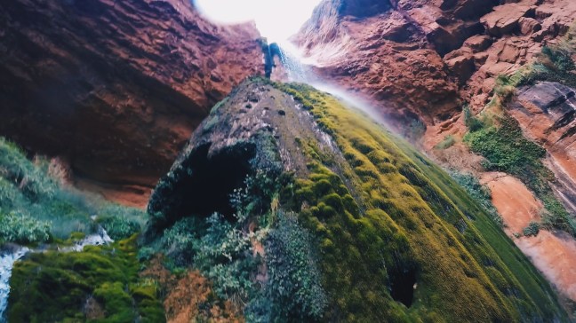 It’s also hard to explain the peaceful, grateful feeling of exploring this little canyon with Emma. Emma takes the trail up to the falls, and looks back over the canyon floor from behind the waterfall curtain. I take a different trail down, and swim into the cave formed at the base of the travertine dome. Time slows down.