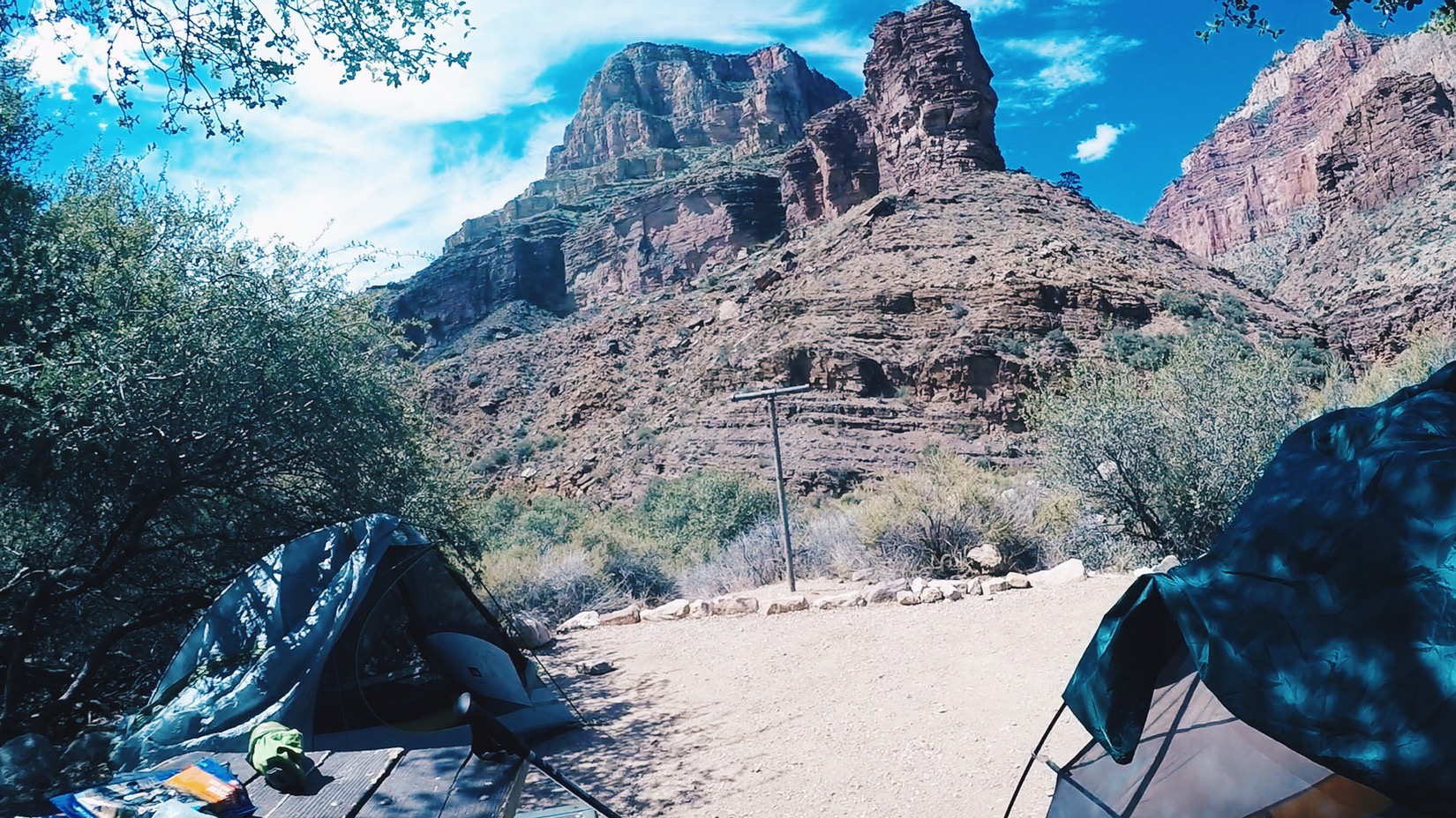 We grab one of 11 spots that are hidden off in the desert on either side of the trail. Our spot looks like it had its own set designer: a a big mesquite to one side of us and a view of the cliffs on the other. We set up our tents in the shade of the tree, hang packs from an iron post, then plunge into the cold, deep pools of Bright Angel Creek to escape the heat.